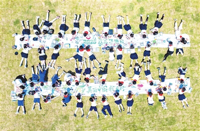 6月4日,江苏省兴化市施耐庵小学学生在“美丽中国我先行”环保主题活动中绘画(无人机照片)。