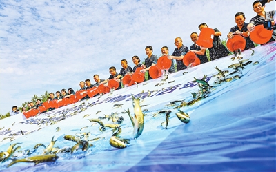 6月4日, 瑞昌市码头镇狗头矶增殖放流点,工作人员将鱼苗投放到长江。在“世界环境日”来临之际,一场覆盖长江中下游四省六地的司法协作增殖放流活动在瑞昌市码头镇狗头矶举行。6月4日,来自沿江的18家法院代表在专业人员指导下,共同向长江投放20万尾青、草、鲢、鳙“四大家鱼”鱼苗,旨在进一步改善长江水质与水域生态环境。(魏东升 摄)