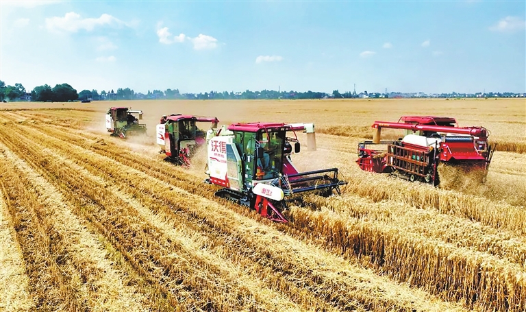 在种植大户范得胜的千亩麦田里,装有北斗导航系统的收割机正精准作业,陆续穿梭在金色“海洋”中。农机手操控着机械精准完成收割、脱粒、分离等一系列工序,麦粒倾泻而下。“我们选用的小麦品种能耐高温,不容易倒,我种了近千亩,预计能收80万斤。”范得胜说,“机器收割每小时能收10亩左右,麦粒直接输送到运粮车,秸秆同步粉碎打捆,省时又省力。”