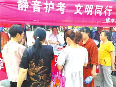 在一些考点周边,一些支行成立了移动服务站,如修水支行工作人员顶着烈日为等候的家长送上遮阳伞、凉扇和矿泉水,让他们在等待中感受一份清凉;同时,倡议市民高考期间保持“静音”状态,为考生营造良好的环境。