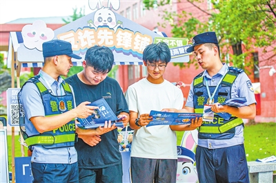 6月21日,在都昌县西湖社区,公安民警邀请居民参与反诈游戏。近日,都昌县公安民警在社区开展反诈宣传活动,民警通过现场宣讲、案例剖析和游戏等形式,向社区居民精准宣传电信网络诈骗和防范要点,帮助居民提高法治意识和防诈反诈能力,共同筑牢反诈“防护墙”。(傅建斌 摄)