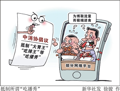 针对以暴饮暴食、猎奇比拼为特征的所谓“吃播秀”,中国消费者协会6月24日发出倡议,指出为博取流量而极端进食的行为是赤裸裸的食物浪费,呼吁广大消费者不追捧、不点赞、不转发极端吃播内容,主动屏蔽相关账号和频道。(新华社发 徐 骏 作)