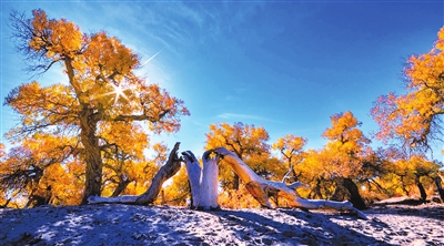 我去过新疆十次,每一次去我都会特别注意观察胡杨树。无论是在阿克苏、喀什,还是在和田、巴音郭楞,抑或是在哈密和克拉玛依等地,每每见到胡杨,心中的敬意便油然而生。尤其是在降雨量极少而蒸发量极大、极度干旱的塔克拉玛干浩瀚的空间里,经历了千余年时间的一棵棵胡杨枯树,日日夜夜被风沙打磨,依然傲立在沙浪滔天、人迹罕至的瀚海之中。胡杨千年不死,胡杨千年不倒,胡杨千年不朽。胡杨生命的顽强成为塔克拉玛干沙漠的永恒标志。