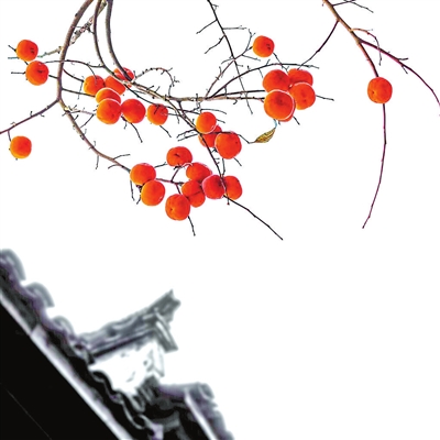做“柿饼”的工序有点复杂,时间长。故乡人先用特制的柿子刀,把较大的硬柿子削掉外皮,接着用带刺儿的树枝,或者葛藤,把削好的柿子穿成一大串,之后,踩着木梯子,把串好的柿子悬挂在屋檐下。远远望去,家家户户的屋檐下,一串串,一排排,通红通红的,成为故乡农村冬日里一道最亮丽的风景。此后,还要经历太阳晒,寒风吹,冰雪冻,逐渐变成酱红色,一直要挂到腊月间,才能取下。再从串子上取下,用手轻轻捏成圆饼状,放在塑料袋里,或者陶瓷罐里,把口密封好。等到表面挂上了一层白霜,便成了“柿饼”。我们在品尝雪白的柿饼时,通常将其掰成两半,在中间放上几粒花生米,或者几瓣核桃仁,味道更佳。我们家乡的柿饼远近闻名,在过年的时候,成为馈赠朋友的佳品。