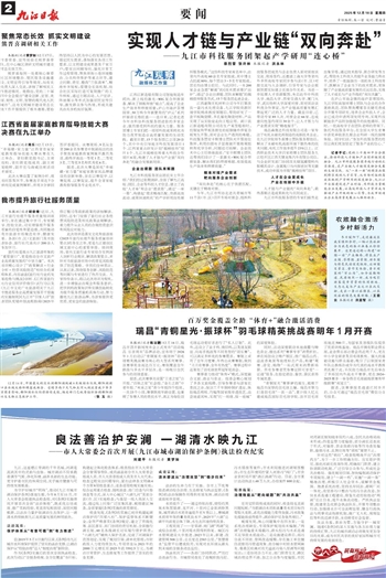 记者手记:党的二十届四中全会提出,推动科技人才链和产业创新链深度融合。九江市科技服务团卓越行动的扎实推进,是产业链人才链深度融合发展的生动实践。从“一库一册”的精准画像到跨区域的人才引育,从专场对接的高效匹配到产学研用的深度融合,九江以平台搭建促进产业对接、用科技力量赋能企业发展,让高校科技人才资源成为驱动产业升级的核心引擎,为我市制造业企业高质量发展注入强劲动力。