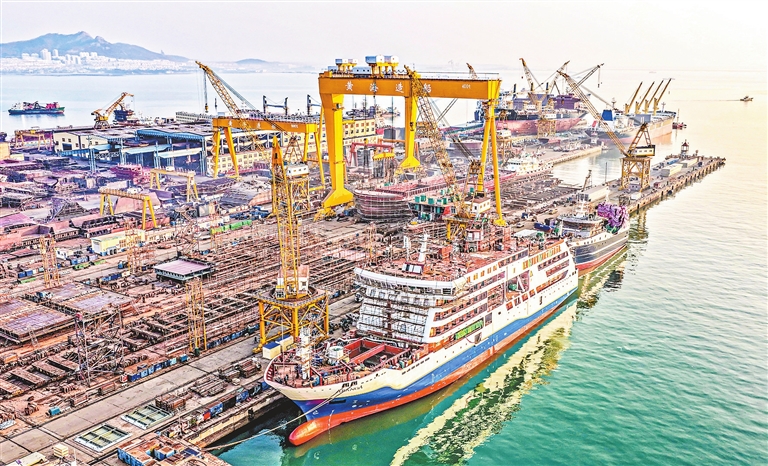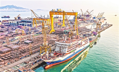 12月16日,在山东省荣成市石岛管理区海工装备产业基地,集装箱货船、大型豪华客货滚装船即将交付客户(无人机照片)。(新华社发 李信君 摄)