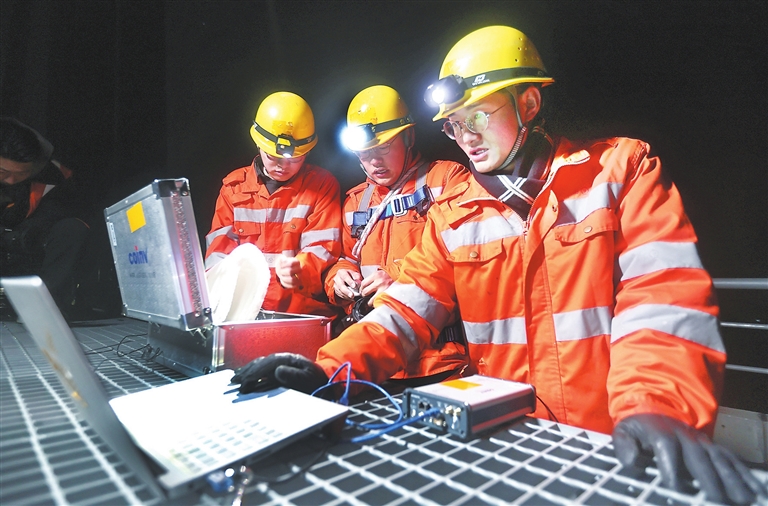 2月2日,春运首日,江风带着冰凉的寒意。当晚11时左右,在京港高铁鳊鱼洲长江大桥上,大桥检查工区的一群“90后”带着“科技伙伴”,爬塔顶、钻箱梁,利用天亮前4小时没有列车通行的时间,对大桥进行保养检修,共同守护大桥安全,保障春运的畅通。鳊鱼洲长江大桥全长2.76公里,是连接湖北省黄冈市与我市的关键过江通道,同时也是京港高铁的控制性工程和我国首座交叉索斜拉桥。(本报记者 欧阳海员 摄)