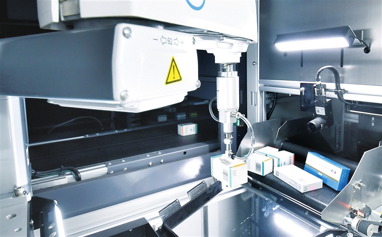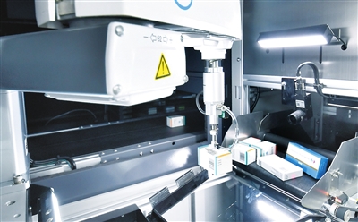 2月3日,北京安贞医院通州院区药房内的药品分拣机器人在工作中。